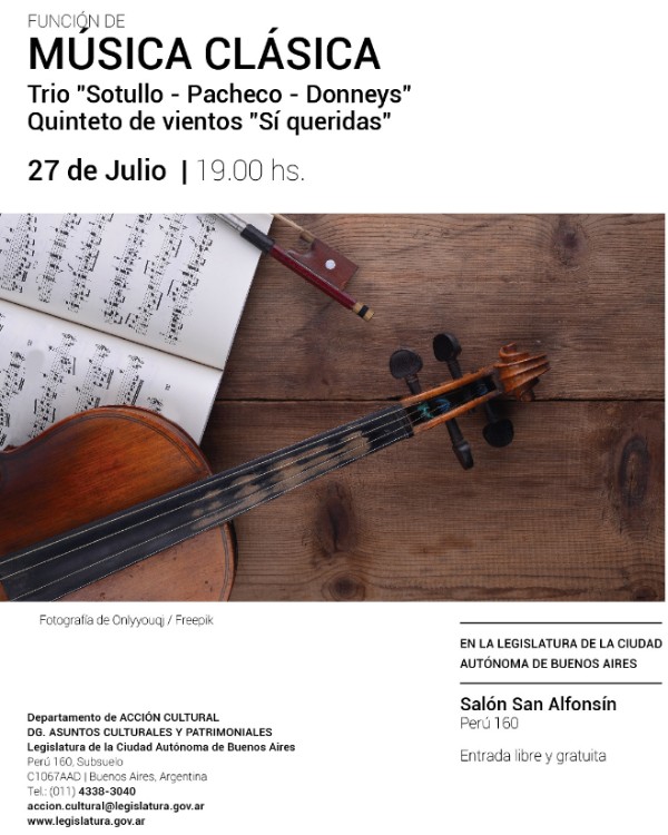 La Dirección General de Asuntos Culturales y Patrimoniales de la Legislatura de la Ciudad Autónoma de Buenos Aires, a través de su Departamento de Acción Cultural, invita a un nuevo concierto de música clásica a realizarse el viernes 27 de julio a las 19 horas en el Salón Alfonsín. En esta ocasión actuarán el Trío “Sotullo – Pacheco – Donneys” y el Quinteto de vientos “Sí queridas”.