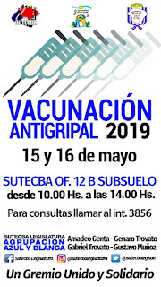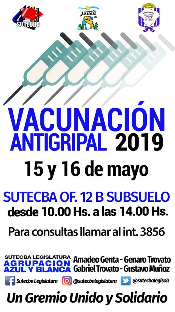 Como todos los años para ésta época, la Agrupación Azul y Blanca de Sutecba Legislatura organiza la Campaña de Vacunación Antigripal. La cepa 2019 será aplicada éste Miércoles 15 y Jueves 16 de Mayo, de 10 a 14 hs, el la Oficina 12 del Subsuelo del Palacio Legislativo. Para consultas, llamar al Interno 3856.